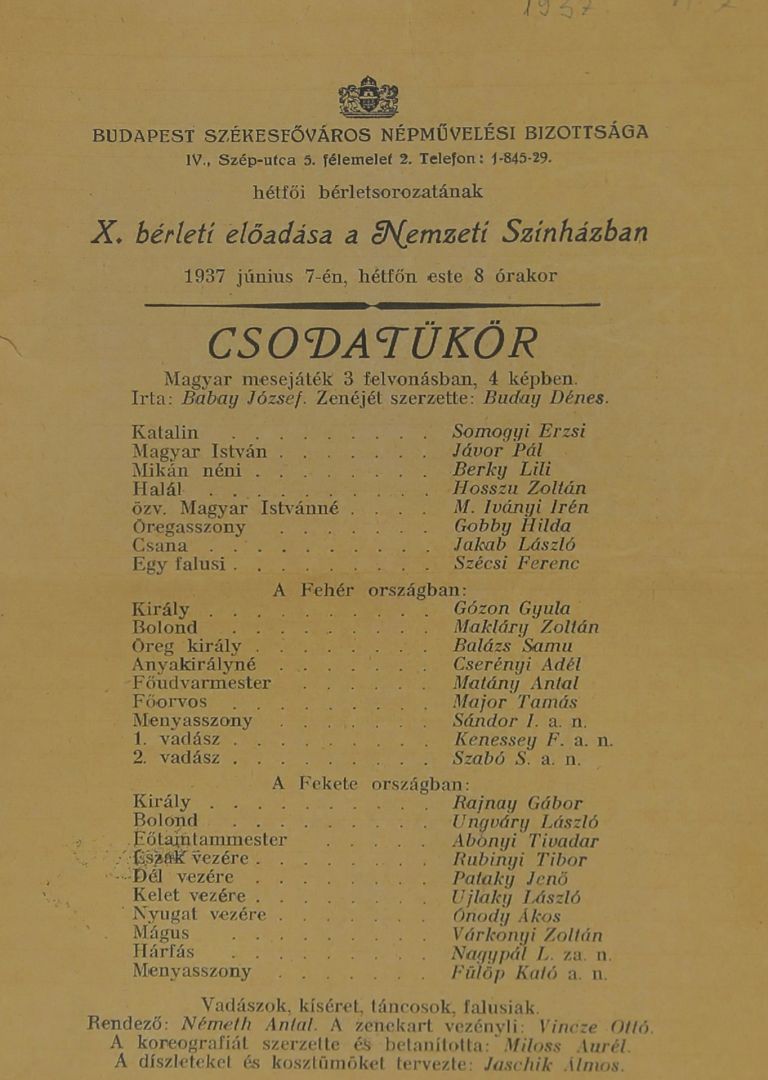 Babay: Csodatükör (mesejáték), bemutatója a Nemzeti Színházban 1937 - ben volt. Lásd a színlap fotóját