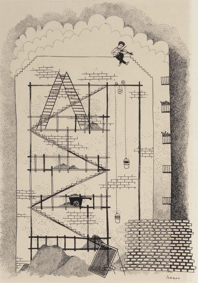 170. / Szenes Zsuzsa (1931 - 2001) / Hegedűs fiú az épülő ház tetején